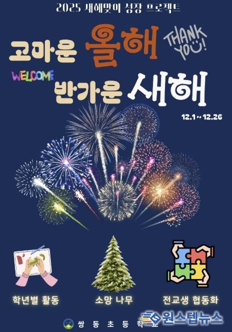 원스텝뉴스 이병희 기자 | 쌍동초등학교는 연말연시를 맞아 전교생이 참여하는 ‘고마운 올해, 반가운 새해’ 새해맞이 성장 프로젝트를 진행했다. 학생들은 한 해를 돌아보고 감사의 마음을 표현하며, 새해 목표를 시각적으로 드러내는 다양한 활동을 경험했다.