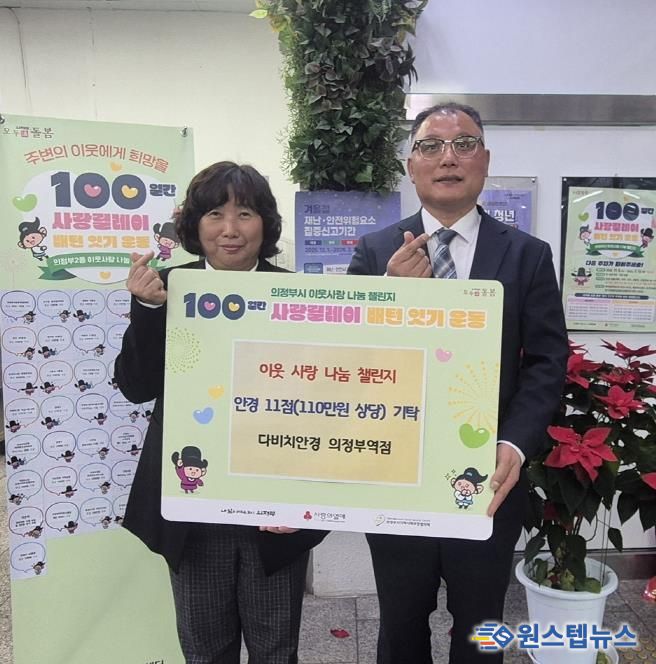 조미경 동장은 “100일간 사랑릴레이에 참여해주신 다비치안경 의정부역점에 진심으로 감사드린다”며 “이번 지원이 취약계층의 시력 개선과 생활 안정에 큰 도움이 될 것으로 기대된다”고 말했다.