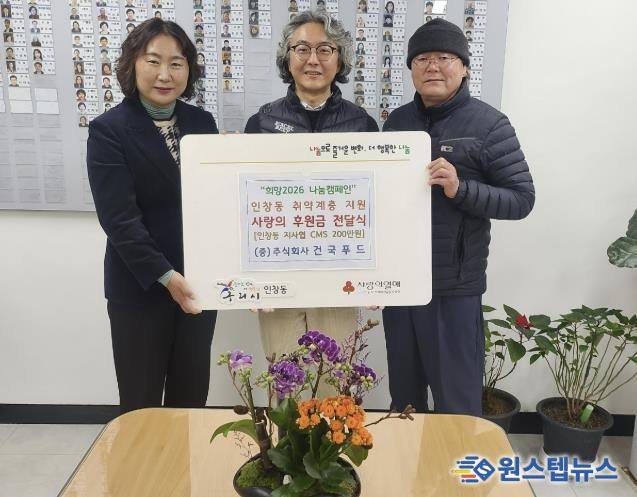 원스텝뉴스 이병희 기자 | 구리시 인창동 행정복지센터는 지난 12월 23일 인창동에 소재한 ㈜건국푸드로부터 취약계층 지원을 위한 후원금 200만 원을 지정 기탁받았다고 밝혔다.