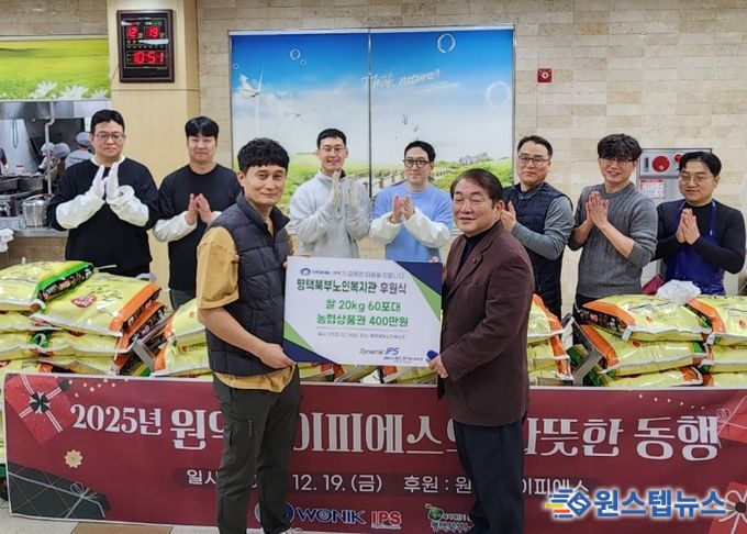 원스텝뉴스 이병희 기자 | 원익IPS는 12월 19일, 평택북부노인복지관에 쌀 20kg 60포와 온누리 상품권 4,000,000원을 기부하며 따뜻한 나눔을 실천했다. 이번 전달식은 지역사회 나눔 문화 확산에 앞장서 온 원익IPS의 꾸준한 사회공헌 활동의 일환으로, 지역 내 어르신들에게 실질적인 도움을 주기 위한 의미있는 기부로 진행됐다.