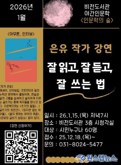원스텝뉴스 이병희 기자 | 평택시 비전도서관은 다음 달 1월 15일 저녁 7시 은유 작가를 초청하여 ‘잘 읽고, 잘 듣고, 잘 쓰는 법’을 주제로 야간 인문학 강연을 진행한다.