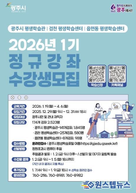 원스텝뉴스 이병희 기자 | 광주시는 12월 29일부터 31일까지 평생학습관, 검천평생학습센터 및 읍면동 평생학습센터에서 운영하는 2026년 제1기 평생학습 프로그램 수강생을 모집한다고 26일 밝혔다.