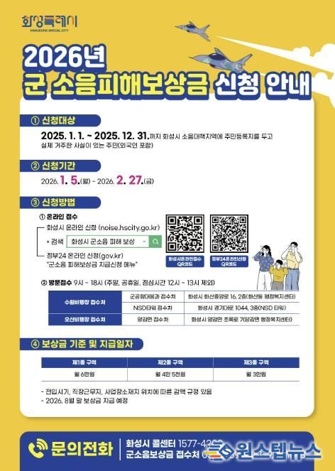 원스텝뉴스 이병희 기자 | 화성특례시는 다음 달 5일부터 2월 27일까지 2026년 군 소음피해보상금 지급 신청을 받는다고 29일 밝혔다.