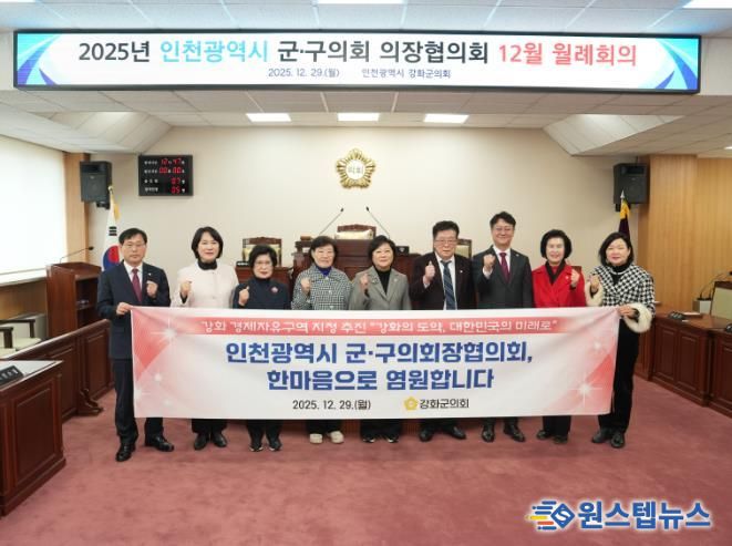 원스텝뉴스 이병희 기자 | 강화군의회는 29일 강화군에서 인천광역시 군·구의회 의장협의회 12월 월례회의를 개최하고 ‘강화 경제자유규역 지정’에 대한 공감대를 함께 나눴다고 밝혔다.
