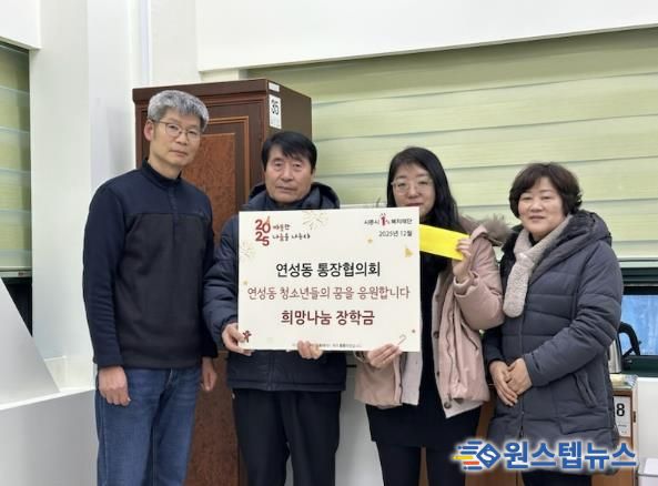 연성동 통장협의회는 통장들의 회비를 모아 이웃을 위한 나눔을 진행하고 있다. 연초에는 산불 피해 성금으로 100만 원을 후원하고, 지난달에는 연성동 취약계층 50여 가구에 김장 김치를 후원한 바 있다. 이번에는 관내 거주하는 중학생에게 각각 20만 원씩 총 60만 원을 전달했다.