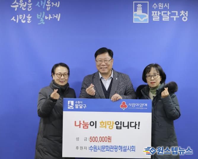 이상균 팔달구청장은 “해마다 변함없이 팔달구를 위해 따뜻한 나눔을 실천해주시는 수원문화관광해설사회에 깊이 감사드린다”며 “기탁해주신 성금은 꼭 필요한 이웃들에게 소중히 전달하겠다”고 밝혔다.