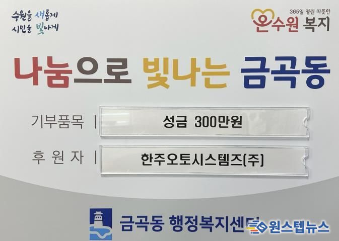 원스텝뉴스 이병희 기자 | 지난 29일 수원시 권선구 금곡동 행정복지센터는 한주오토시스템즈(주)로부터 저소득 가정을 지원하기 위한 성금 300만 원을 전달받았다고 밝혔다.