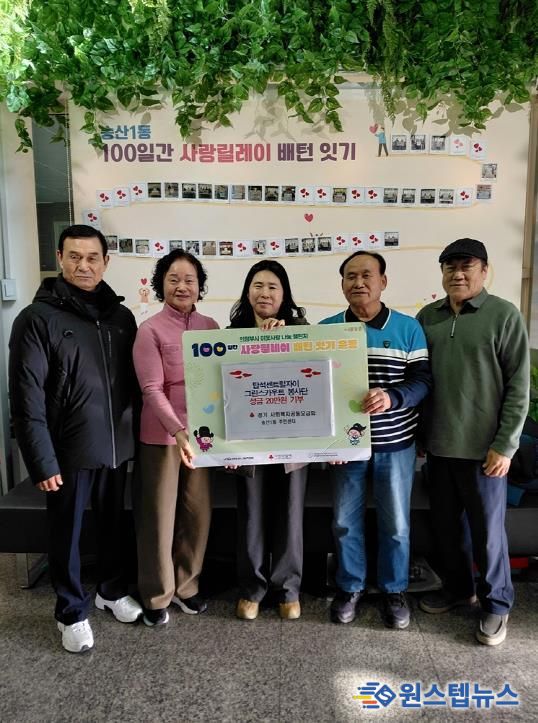 원스텝뉴스 이병희 기자 | 의정부시 송산1동주민센터는 12월 22일 용현동 소재 탑석자이그린스카우트 봉사단이 ‘100일간 사랑릴레이 배턴 잇기’에 동참해 취약계층을 위한 성금 20만 원을 후원했다고 밝혔다.