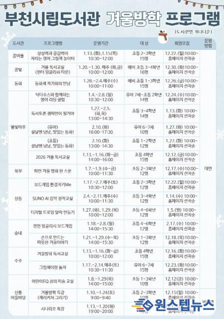 원스텝뉴스 이병희 기자 | 부천시는 겨울방학을 맞아 내년 1월부터 2월까지 부천시립도서관에서 전 연령을 대상으로 독서문화 프로그램과 행사를 운영한다고 30일 밝혔다. 이번 프로그램은 연령과 관심사에 따라 다양한 참여 기회를 제공하기 위해 마련됐다.