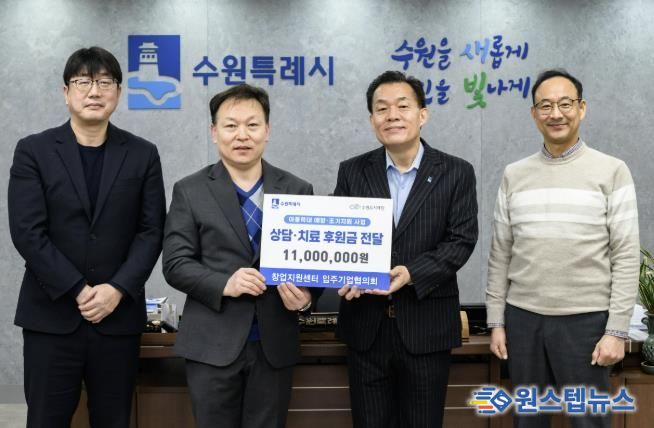 원스텝뉴스 이병희 기자 | 수원시 창업지원센터 입주기업협의회가 “학대 피해아동 지원에 사용해 달라”며 수원시에 후원금 1100만 원을 전달했다. 전달식은 30일 이재준 수원시장 집무실에서 열렸다.