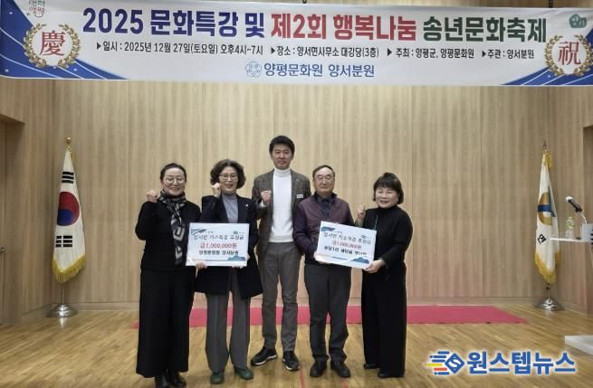 원스텝뉴스 이병희 기자 | 양평군 양서면은 지난 27일 저소득층을 돕기 위한 기부금 기탁식이 진행됐다고 밝혔다. 이번 기탁은 양평문화원 주최, 양평문화원 양서분원 주관으로 열린 ‘2025 문화 특강 및 제2회 행복나눔 송년문화축제’를 계기로 마련됐다.