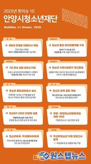 원스텝뉴스 이병희 기자 | 안양시청소년재단은 올 한 해를 돌아보는 ‘2025년 안양시 청소년재단 핫이슈 10’을 선정하고, 2025년 청소년 정책 컨트롤타워로서의 기능을 강화해 청소년 체감형 정책 성과를 거뒀다고 30일 밝혔다.