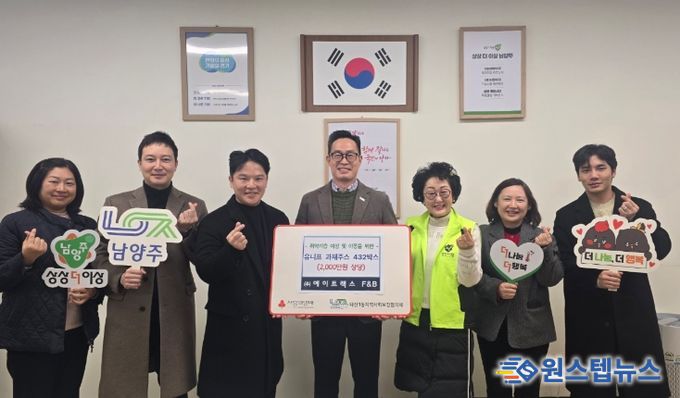 원스텝뉴스 이병희 기자 | 남양주시는 30일 다산행정복지센터에서 ㈜에이트랙스 에프앤비가 지역 아동을 위한 과채주스 432박스를 전달했다고 밝혔다.