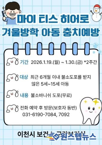 참여를 희망하는 보호자는 이천시 보건소 구강보건실로 전화 예약 후 사업 기간 내(2026. 1. 19. ~ 1. 30.) 아동과 함께 방문하면 된다.