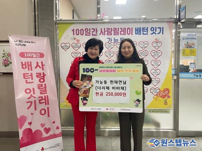 원스텝뉴스 이병희 기자 | 의정부시 가능동주민센터는 12월 29일 더리체 비바체가 관내 어려운 이웃을 돕기 위해 성금 25만 원을 기탁하며 ‘100일간 사랑릴레이 배턴 잇기’에 동참했다고 밝혔다.