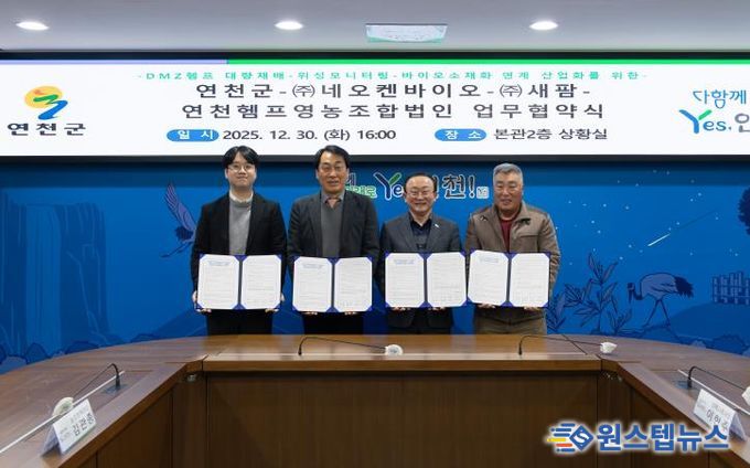 원스텝뉴스 이병희 기자 | 연천군은 지난 30일 연천군청 본관 2층 상황실에서 ㈜네오켄바이오, ㈜새팜, 연천헴프영농조합법인과 함께 DMZ 지역 헴프(대마) 산업의 체계적 육성과 산업화를 위한 업무협약을 체결했다.