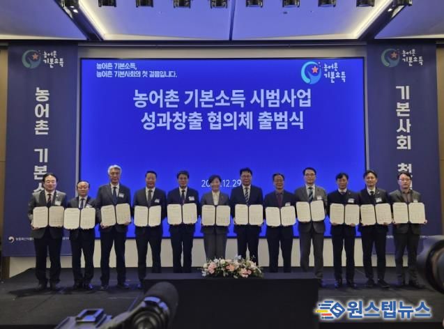 행사에서는 기본사회 강연을 시작으로 농어촌기본소득 시범사업 추진계획과 지역별 특화모델 운영 방향, 연구단 구성·운영 및 정책평가 계획이 공유됐다. 이어 농식품부–경인사연–10개 군이 참여하는 업무협약 체결과 협의체 출범 퍼포먼스, 기념촬영이 진행됐다.