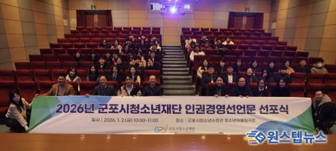 시무식에서는 김덕희 대표이사의 신년 인사말씀을 시작으로, 재단의 경영 철학과 가치 실현 의지를 담은 군포시청소년재단 인권·경영 선언문 선포식이 진행됐다. 이를 통해 재단은 인권 존중을 기반으로 한 책임 있는 경영과 청소년 중심의 공공기관 운영 의지를 공식화했다.