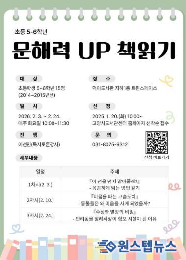 원스텝뉴스 천규영 기자 | 고양특례시 덕이도서관은 2026년 겨울방학을 맞아 아동과 청소년을 대상으로 한 독서·글쓰기 프로그램을 운영한다.