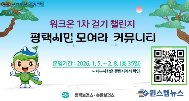 원스텝뉴스 이병희 기자 | 평택시는 시민들의 건강한 생활습관 형성을 지원하기 위해 오는 1월 5일부터 2월 8일까지 한 달간 워크온(WalkOn) 앱 내 ‘평택시민 모여라’ 커뮤니티를 통해 제1차 걷기 선착순 챌린지를 운영한다.