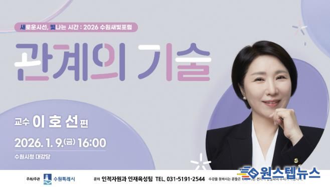 원스텝뉴스 이병희 기자 | ‘새로운 시선, 빛나는 시간’ 수원새빛포럼의 2026년 첫 강사로 심리상담가 이호선 숭실사이버대 교수가 나선다. 수원새빛포럼은 1월 9일 오후 4시 시청 대강당에서 열린다.