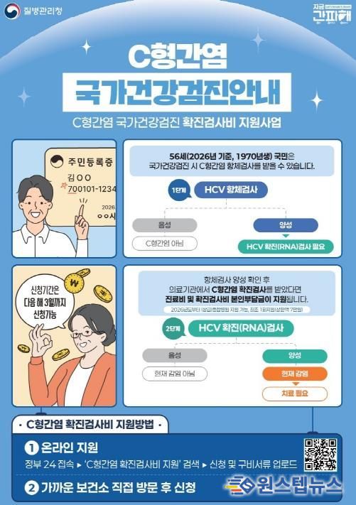 지원 대상은 56세 국가건강검진에서 C형간염 항체 양성판정을 받고 확진 검사(HCV RNA)를 받은 시민(2026년 기준 1970년생)으로, 확진 검사 시 수반되는 진찰료와 검사비 본인부담금을 최초 1회에 한해 최대 7만 원까지 지원한다.