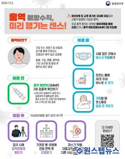 전진선 양평군수는 “홍역은 전염성이 매우 높은 감염병인 만큼 해외여행을 계획하고 있다면 출국 전 예방접종 여부를 반드시 확인하고, 여행 중에도 개인위생 수칙을 철저히 지켜주시기를 당부드린다”며 “해외 방문 후 3주 이내 발열이나 발진 등 홍역 의심 증상이 나타날 경우 마스크를 착용한 상태로 의료기관을 방문하여 해외 방문력을 알리고 진료를 받아주시길 바란다”고 밝혔다.