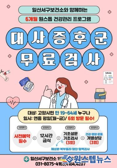 원스텝뉴스 이병희 기자 | 고양특례시 일산서구보건소는 대사증후군 검진 및 맞춤형 건강상담을 한 곳에서 받을 수 있는‘건강원스톱서비스’를 연중 상설 운영한다.