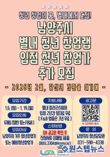 원스텝뉴스 이병희 기자 | 남양주시는 6일부터 청년 창업가들을 위한 ‘남양주시 별내 청년 창업랩’입점자를 추가 모집한다고 밝혔다.