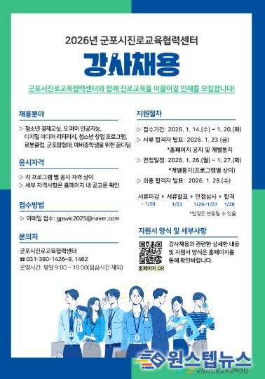원스텝뉴스 이병희 기자 | (재)군포시청소년재단 군포시진로교육협력센터는 관내 청소년의 진로 탐색과 진로 역량 강화를 위해 '2026년 군포시진로교육협력센터 강사'를 채용한다고 밝혔다.