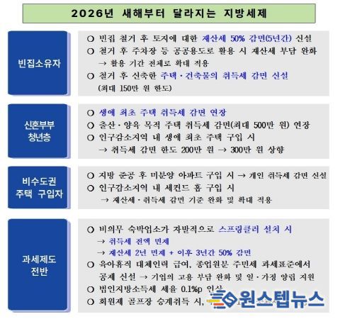 이번 개정은 △빈집 정비 △출산·양육 주택 취득 지원 △지역 균형발전 △공정 과세체계 구축에 중점을 두고 추진됐다.
