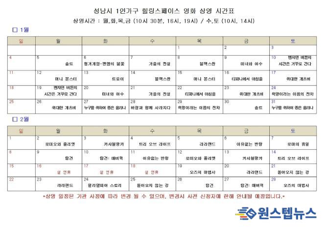 원스텝뉴스 이병희 기자 | 성남시는 오는 2월 28일까지 1인 가구 힐링 스페이스 커뮤니티 홀(중원구 둔촌대로 100 4층)에서 ‘추억의 할리우드 영화’를 총 120회 무료 상영한다.