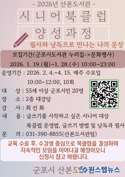 함께 글쓰기 및 독서에 관심있는 관내 55세 이상 시니어라면 누구나 신청 가능하며, 1월 19일부터 선착순으로 20명을 모집한다. 신청은 군포시도서관누리집 문화행사신청 또는 전화 접수가 가능하다.