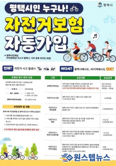 원스텝뉴스 이병희 기자 | 평택시가 시민의 안전한 자전거 이용을 위해 전 평택시민을 대상으로 하는 자전거 보험을 2026년에도 갱신 가입하고, 각종 자전거 사고에 대비한 보장을 지속 제공한다고 밝혔다.