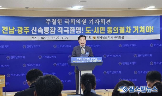 원스텝뉴스 이병희 기자 | 주철현 더불어민주당 국회의원(전남 여수시갑)은 7일 오후 2시 30분, 전남도의회 브리핑룸에서 기자회견을 열고, 광주·전남 행정통합에 대한 적극적인 환영 입장과 함께 통합의 방향에 대한 의견과 비전을 밝혔다.