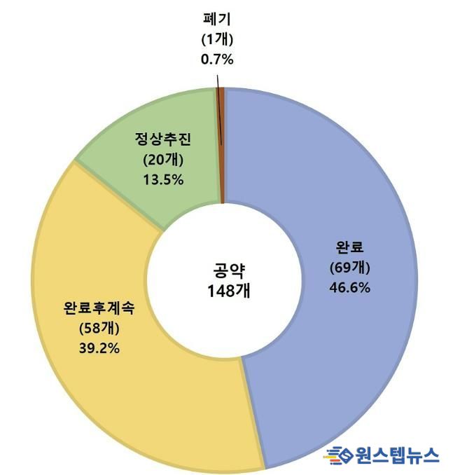 공약 완료율은 85.8%(127개)다. 공약 이행률 96.1%는 완료사업(69개·이행률 100%)과 완료 후 계속 추진(58개·이행률 100%), 정상 추진(20개) 중인 사업별 추진 정도를 백분율로 환산한 평균값이다.