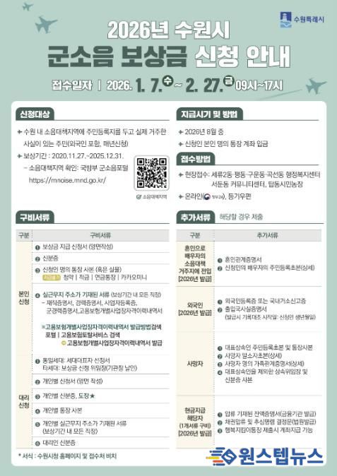 원스텝뉴스 이병희 기자 | 수원특례시는 2월 27일까지 ‘2026년 군소음 피해보상금’ 신청을 받는다.