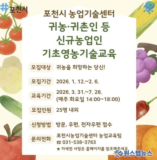 원스텝뉴스 이병희 기자 | 포천시농업기술센터 2026년 포천시 귀농·귀촌인 등 신규농업인 기초영농기술교육’ 교육생을 오는 2월 6일까지 모집한다.