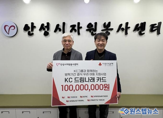 원스텝뉴스 이병희 기자 | 지난 5일, 안성시자원봉사센터는 KC그룹과 함께 ‘KC 드림나래 카드’ 전달식을 갖고, 겨울방학 기간 중 결식이 우려되는 아동들을 위한 따뜻한 지원에 나섰다. 이날 전달식에는 김동성 안성시자원봉사센터장과 ㈜케이씨텍의 양호근 대표이사가 참석했다.