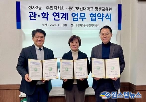 원스텝뉴스 이병희 기자 | 수원시 장안구 정자3동 행정복지센터와 주민자치회는 지역 내 협력 기반을 구축해 주민 맞춤형 프로그램을 확대하고자 지난 8일 동남보건대학교 평생교육원과 업무협약을 체결했다.
