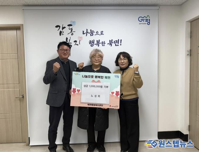 원스텝뉴스 이병희 기자 | 가평군 북면 지역사회보장협의체 노성희 위원장은 최근 행정복지센터를 방문해 어려운 이웃들을 위해 성금 100만원을 기탁했다.