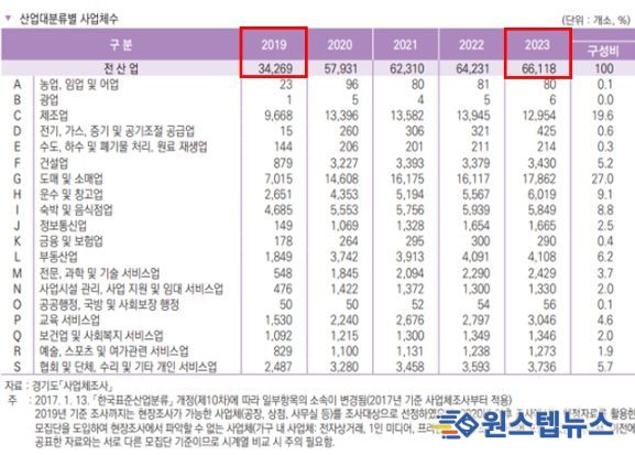 먼저, ▲기업체 분야를 살펴보면 2023년 기준 김포시 전체 사업체 수는 66,118개소로, 2019년 대비 31,849개소(92.9%↑)가 증가했다. 특히 에너지 산업(전기·가스 등) 분야의 성장세가 뚜렷했으며, 300~499명 규모의 중대형 사업체도 250% 늘어 지역 경제의 자족 기능이 강화되고 있는 것으로 분석된다.