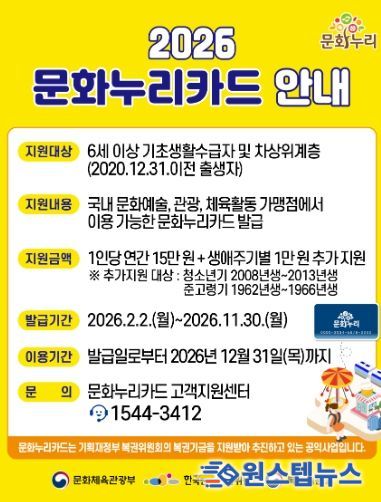 원스텝뉴스 천규영 기자 | 정부 정책에 따라 2026년부터 통합문화이용권(문화누리카드)과 청년문화예술패스 제도가 개편된다. 이에 따라 양주시는 개편 기준에 맞춰 지역대상자를 대상으로 해당 사업을 확대 시행한다고 밝혔다.