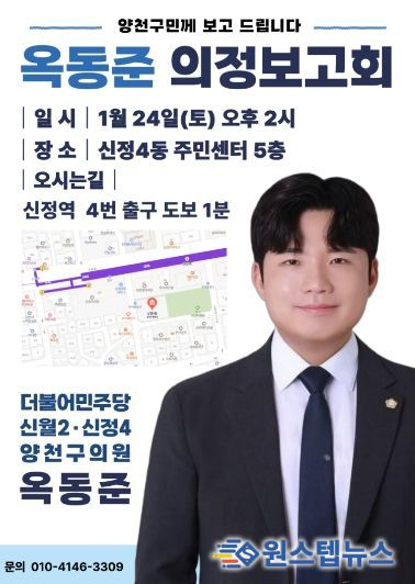 원스텝뉴스 이병희 기자 | 양천구의회 옥동준 의원(더불어민주당, 신정4·신월2동)이 오는 24일 오후 2시 양천구 신정4동 주민센터에서 의정보고회를 열어 그간의 의정활동 성과와 향후 계획을 양천구민께 보고하는 자리를 마련한다.
