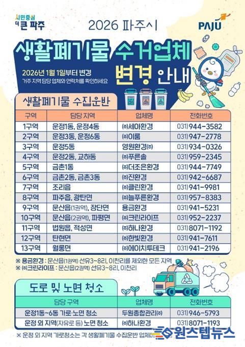 원스텝뉴스 이병희 기자 | 파주시는 2026년 1월 1일부터 관내 생활폐기물(쓰레기) 수집·운반 대행업체가 변경됨에 따라, 시민에게 정확한 정보를 안내하고 현장 운영이 원활히 정착될 수 있도록 홍보와 안내를 강화하고 있다고 밝혔다.