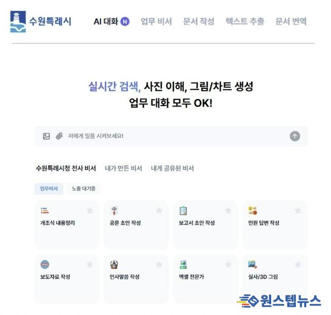 원스텝뉴스 이병희 기자 | 수원특례시가 생성형 인공지능(AI)을 행정 전반에 활용하기 위해 12일 공직자를 대상으로 ‘수원 인공지능(AI) 업무 비서’ 서비스를 개시했다.