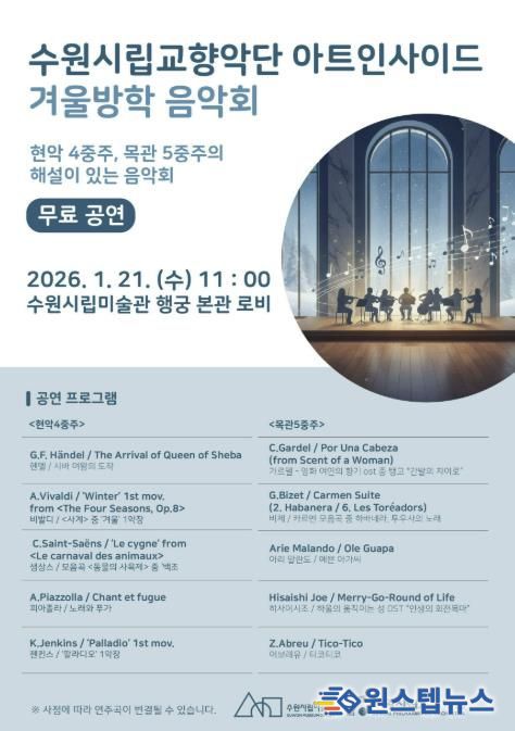 1월 21일 오전 11시에 수원시립교향악단 아트인사이드 '겨울방학 음악회'가 무료로 개최된다. 현악 4중주와 목관 5중주의 해설이 있는 음악회로 상생스의 모음곡 '동물의 사육제' 중 백조, 피아졸라의 '노래와 푸가', 영화 '여인의 향기' OST 중 탱고 ‘간발의 차이로’, 히사이시조의 '하울의 움직이는 성' OST 중 ‘인생의 회전목마’등을 연주한다.
