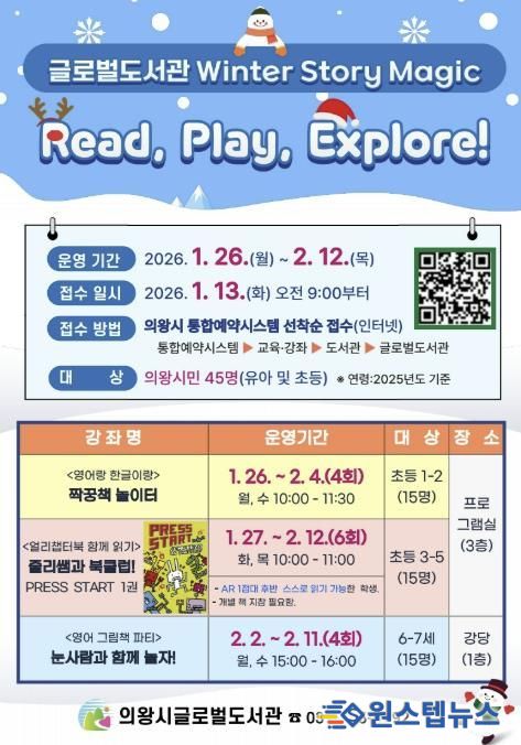 원스텝뉴스 이병희 기자 | 의왕시 글로벌도서관(보식골로 30-10)이 영어책과 함께하는 즐거운 겨울방학을 보낼 수 있도록 유아, 초등학생 대상 특별 프로그램 'Winter Story Magic: Read, Play, Explore!'를 1월 26일부터 2월 12일까지 진행한다.