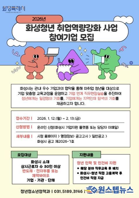 원스텝뉴스 이병희 기자 | 화성특례시가 12일부터 다음 달 13일까지 청년 구직자의 실질적인 직무역량 강화와 지역 전략산업 맞춤형 인재 양성을 위한 ‘2026년 화성청년 취업역량강화 사업’ 참여기업을 모집한다.
