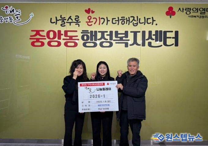 이번 기탁은 중앙동에서 추진 중인 ‘해뜰릴레이’의 첫 번째 나눔으로, ‘해뜰릴레이’는 후원금과 후원품 기부자를 중심으로 릴레이 형식의 나눔을 이어가며 기부 문화 확산과 지속적인 이웃사랑 실천을 도모하는 사업이다. 특히 이번 후원은 2026년 병오년 새해를 여는 첫 해뜰릴레이로, 지역사회에 따뜻한 나눔의 의미를 더했다.
